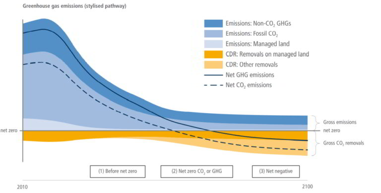Emissions reductions and removals required for the Paris goals over time (IPCC, 2022, Ch. 12); Source: CCA’s report