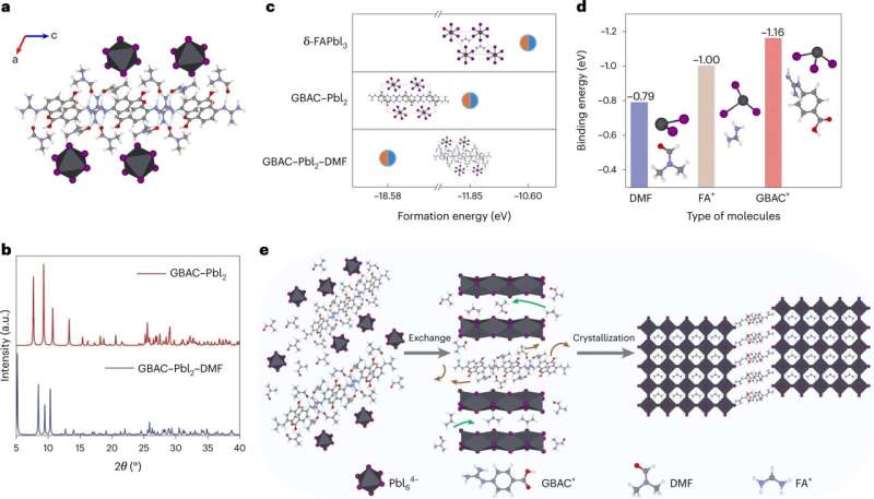 To tackle these issues, the CityU researchers developed a simple but effective strategy of modulating the perovskite film growth to enhance the film quality. They found that by adding a multifunctional molecule (4-guanidinobenzoic acid hydrochloride, (GBAC)) to the perovskite precursor, a hydrogen-bond-bridged intermediate phase is formed and modulates the crystallization to achieve high-quality perovskite films with large perovskite crystal grains and coherent grain growth from the bottom to the surface of the film.