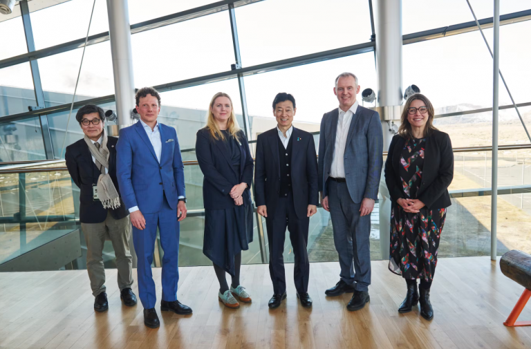 Japan’s ambassador to Iceland, Ryotaro Suzuki, Christoph Gebald, CEO of Climeworks, Edda Aradóttir, CEO of Carbfix, Yasutoshi Nishimura, Minister of Economy, Trade and Industry in Japan, Sævar Freyr Þráinsson, CEO of Reykjavik Energy and Berglind Rán Ólafsdóttir CEO of ON Power. (source: Carbfix)