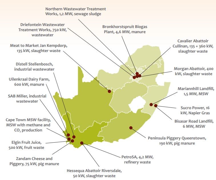 Map of selected biogas digesters installed in South Africa. Image credit: Biogas Guidebook