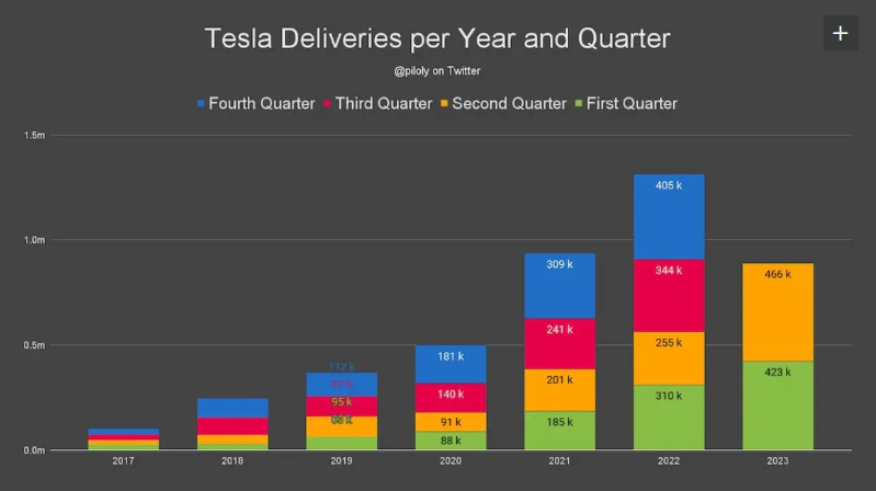 Tesla’s Q2 sales were up 10% quarter-on-quarter from Q1’s previous record of 422,875. Year-on-year Q2 sales were up a staggering 83% over Q2 2022, as shown in the graph below from Roland Pircher.