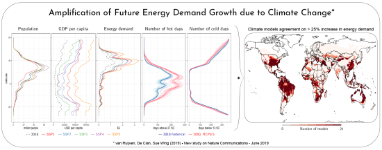 In this new study, the authors did a global analysis using temperature projections from 21 climate models, and population and economy projections for five socioeconomic scenarios. This information was fed into a statistical model to calculate changes in demand for three fuels and four economic sectors, to determine how energy demand would shift relative to today’s climate under modest and high-warming scenarios around 2050.