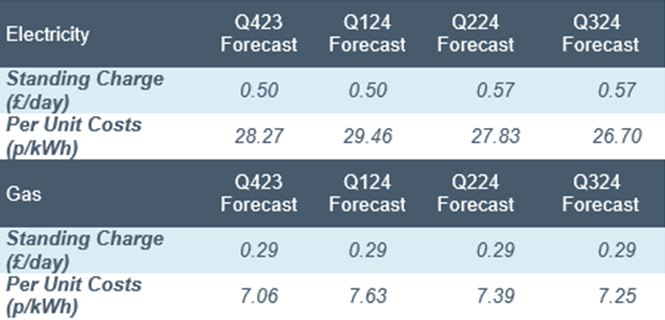 Figure 2: Cornwall Insight’s Default Tariff cap forecasts using new Typical Domestic Consumption Values: Standing charge and unit rate (dual fuel, direct debit customer)