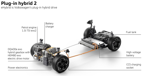 In addition, the combination of electric drive motor and new economical turbocharged gasoline engine (1.5 TSI evo2) provides overall ranges of around 1,000 km.