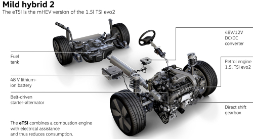 New 48 V mild hybrid. Also new on board the Passat is a 48 V mild hybrid drive (eTSI with 110 kW / 150 PS) that transforms kinetic energy into electric energy and makes it possible to coast without using the combustion engine.