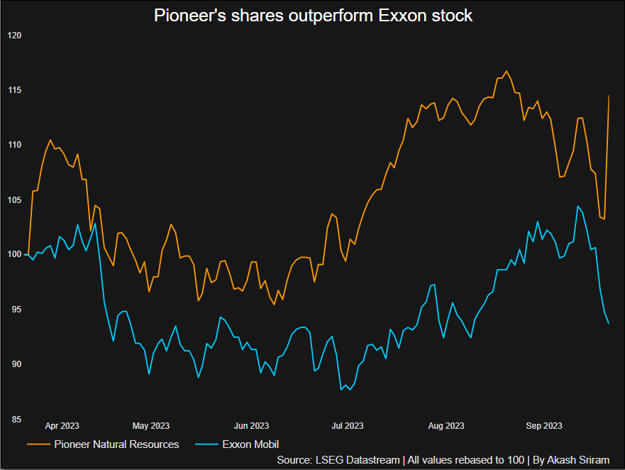 Pioneer's shares were trading at $238.50 on Friday, valuing the company at nearly $56 billion, while Exxon shares were down 1.2%. The offer implies a roughly 20% premium to Pioneer's Thursday close. A deal's value can change at any time in negotiations.