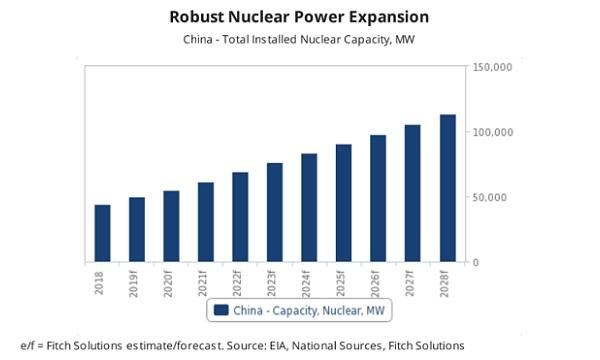China is expected to remain a global outperformer in nuclear power, with its capacity projected to expand from the 44.6GW as of end-2018 to 113GW or over 25% of the global capacity by end-2028, according to Fitch Solutions.