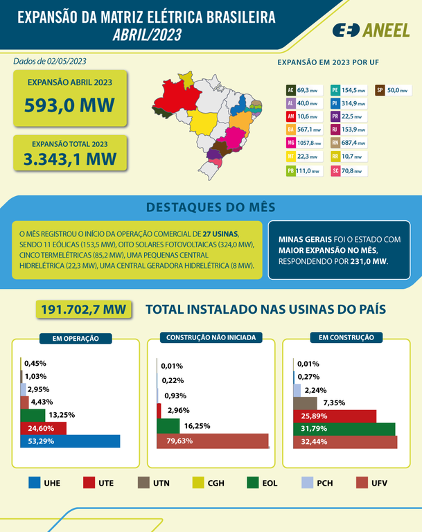 Also according to Aneel, around 104 plants will enter commercial operation in 2023, in 15 Brazilian states. So far, Minas Gerais leads the highest result with 1 GW, followed by Rio Grande do Norte (687 MW) and Bahia (567 MW).