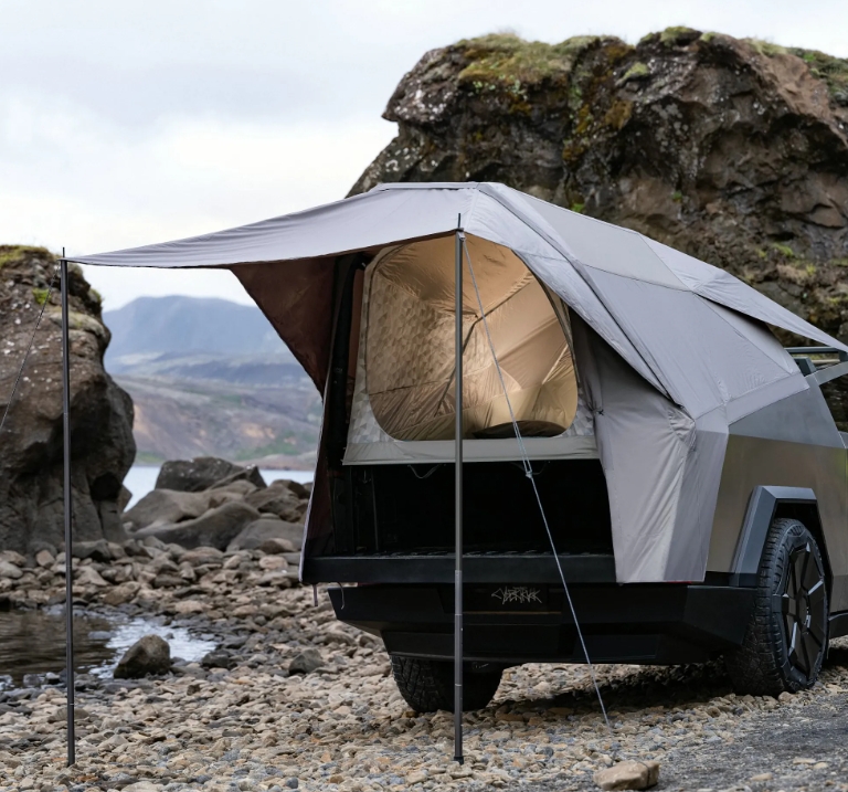 We learned about the imminent release of the Cybertruck “basecamp” through a leak in a Tesla app update yesterday, which revealed renderings of the accessory.