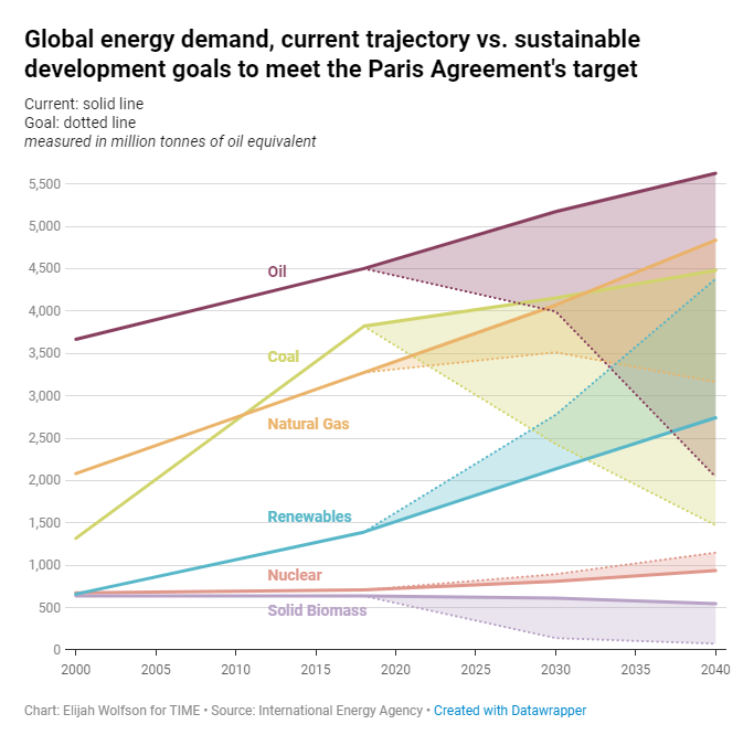 At the heart of the IEA’s annual outlook is energy demand: a measure of how much energy we use to heat our homes, drive our cars and power our factories and, by extension, a measure of our emissions of climate-change causing pollutants. Global energy demand grew by 2.3% in 2018 last year, the largest since 2010, according to the report. And, under policies currently in place, the use of climate-change causing fossil fuels including coal, oil and natural gas will continue to expand in the coming years at a rate of 1.3% per year through 2040.