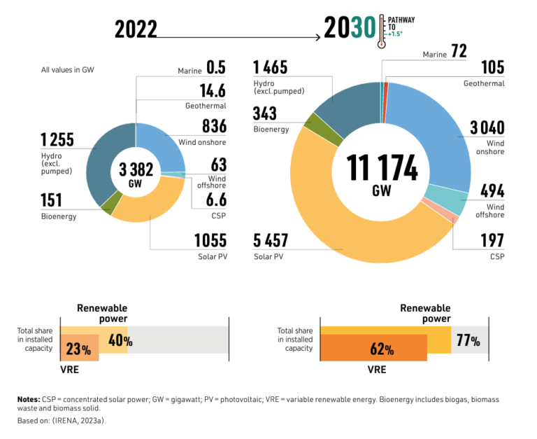 Global installed renewable electricity generation capacity in the 1.5°C Scenario, 2022 and 2030 (source: IRENA, “Tripling renewable power and doubling energy efficiency by 2030: Crucial steps towards 1.5°C”)