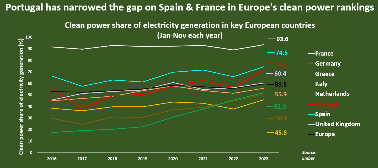 That mix of high volumes of clean power and low fossil-fuel use cemented Portugal's status as the third-cleanest major power system in Europe behind Spain and France.