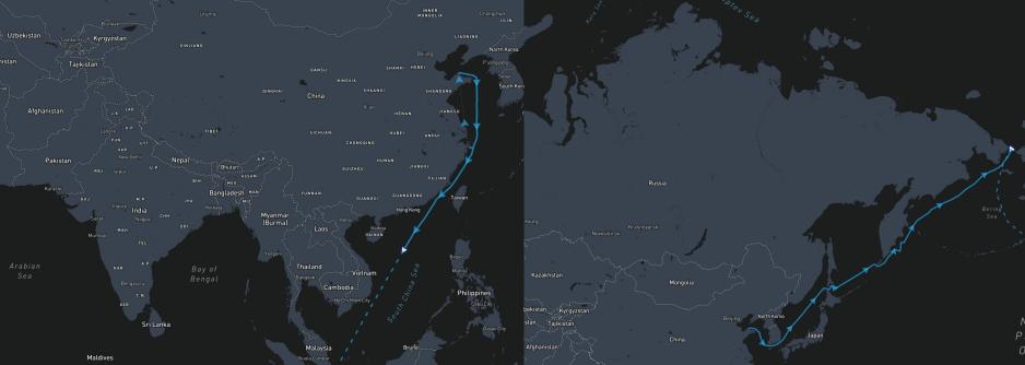 Route of Hunter Star (left) and Audax and Pugnax (right) following their departure from the Penglai Jutal Offshore Engineering (PJOE) yard in the Chinese province of Shandong. (Source: Maritime Optima)