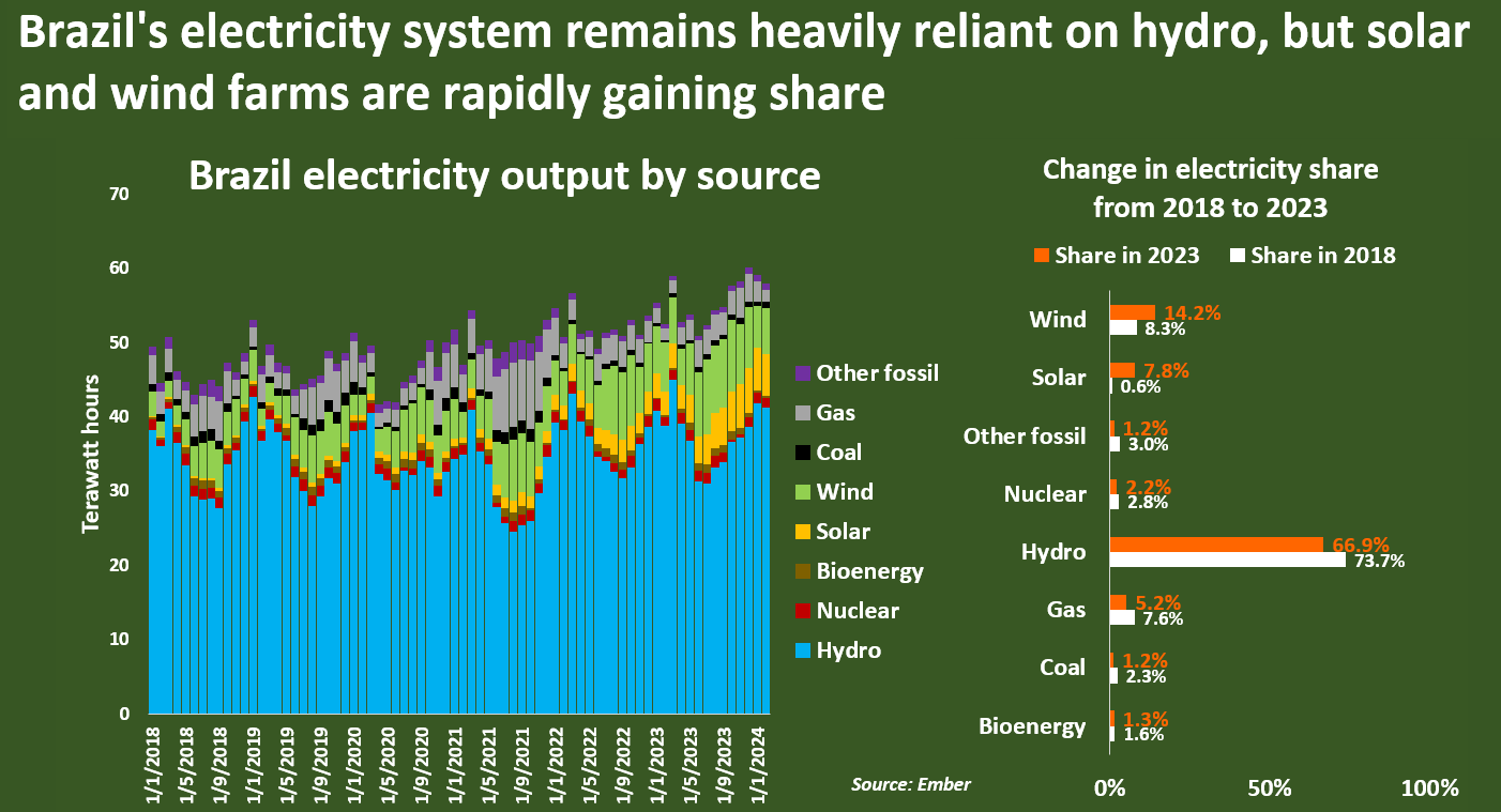 Brazil's electricity system remains heavily reliant on hydro, but solar and wind farms are rapidly gaining share