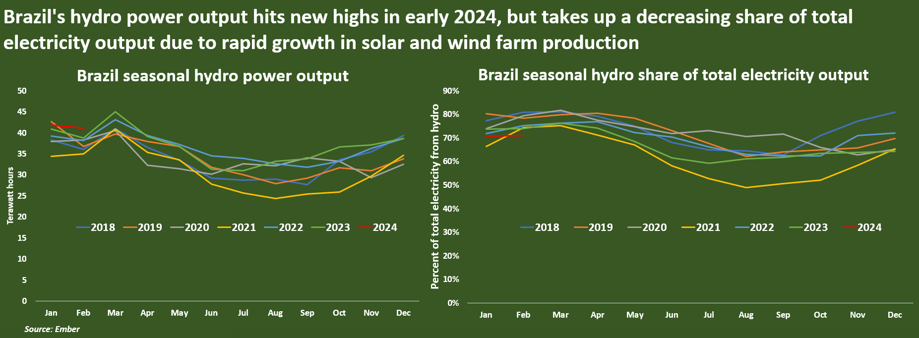 Brazil's hydro power output hits new highs in early 2024, but takes up a decreasing share of total electricity output due to rapid growth in solar and wind farm production