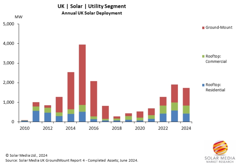The UK’s new solar deployment for 2024 is forecast to be down year-on-year compared to 2023, as installations remain relatively stable across residential, commercial rooftop and ground-mount segments, writes Solar Media analyst Josh Cornes.