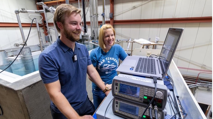 Kyle Reed and Dianne Ezell gather data as the sensor transistor is tested in the reactor pool, which can be seen behind them (Image: Michael Huson/The Ohio State University)