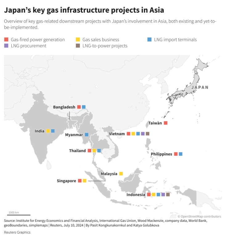 Led by JERA, Tokyo Gas, Osaka Gas (9532.T), opens new tab and Kansai Electric Power (9503.T), opens new tab, Japan is a stakeholder, feedstock provider or participant in studies for more than 30 gas-related projects, data from the Institute for Energy Economic and Financial Analysis (IEEFA) and Reuters shows.
