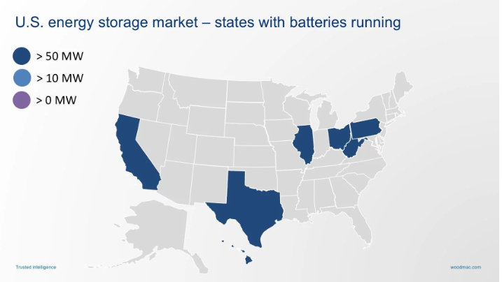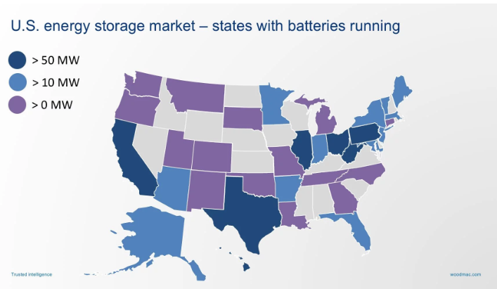 The blue cluster of states to the east reflects the first commercial storage market, serving a fast frequency regulation market in the PJM grid. That market burned brightly for several years but dimmed when rule changes made the service less valuable.