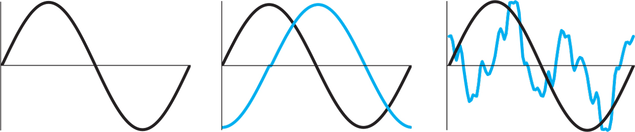 Power Factor: The relationship between the voltage and current waveforms influences power factor, a measure of how much current on a line is doing work versus the capacity of the line. In the ideal situation, the two waveforms are perfectly in phase with each other [left]. Inductive or capacitive loads can cause the current to lead or lag the voltage, reducing the power factor [center]. Harmonic distortion [right], which occurs when current flows at different frequencies than the voltage, reduces the power factor even further.