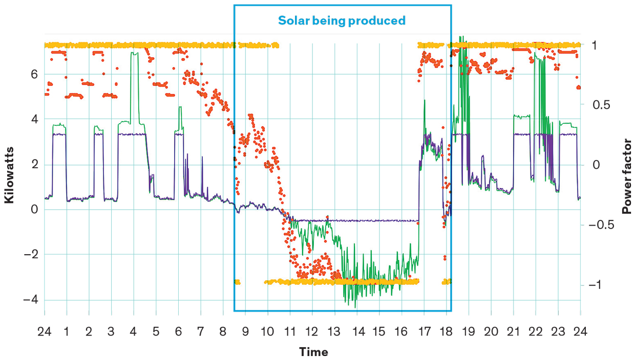 During the day, as different appliances are turned on and off, the house draws varying amounts of power [green]. These appliances reduce the home’s power factor [orange] by shifting current and voltage out of phase or by distorting the current waveform. The power factor decreases even more as the home’s solar array begins to produce power [center]. The grid must be able to compensate for both phase and distortion. The Energy Switch—the home’s energy-storage and microgrid system—limits the biggest power draws [purple]. The system also takes some of the burden from the grid by increasing the power factor. As a result, the home acts as either a simple load [yellow] or a power generator.