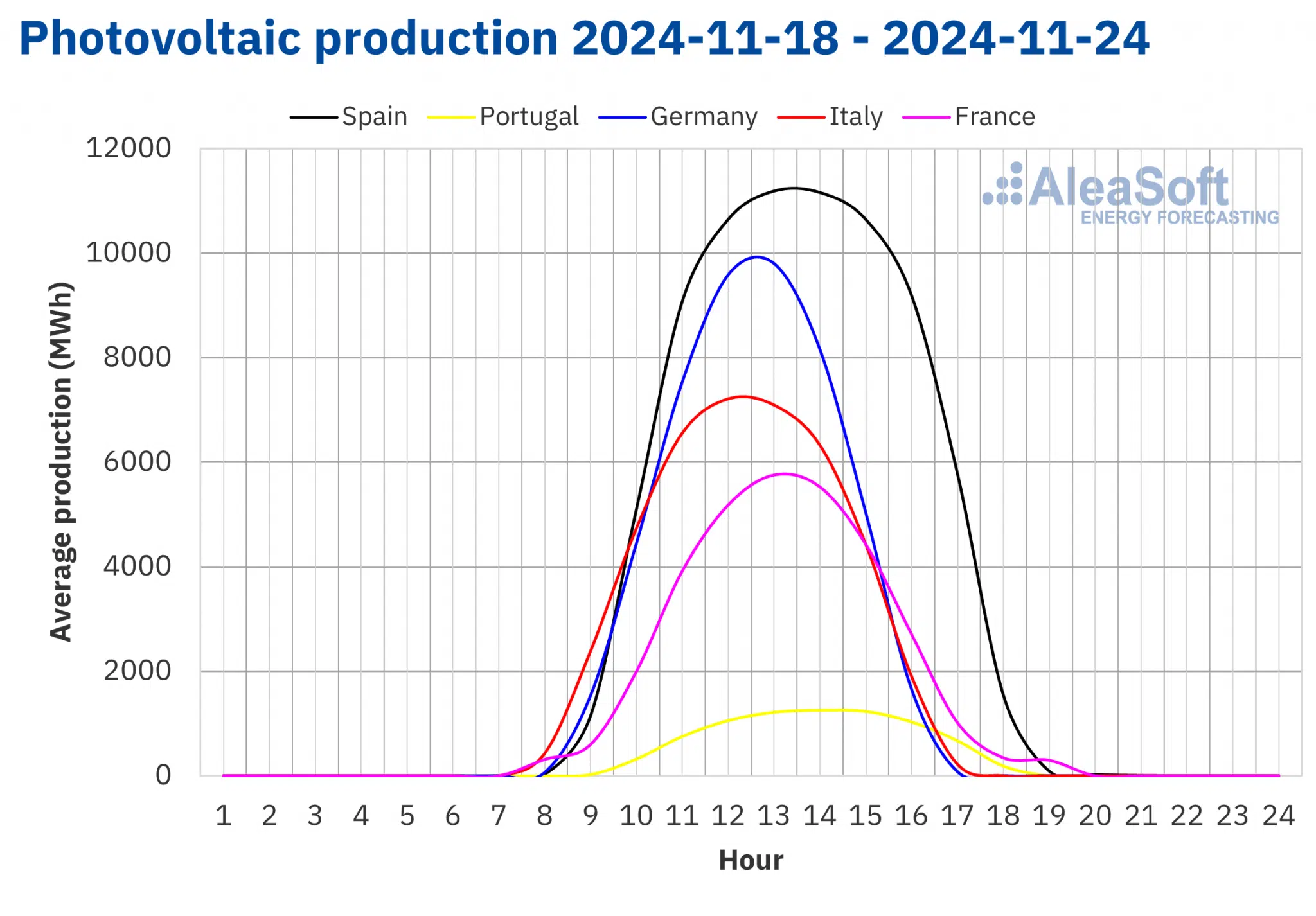 In the week of November 18, solar photovoltaic energy production increased compared to the previous week in the Spanish and German markets. In Spain, the increase was 1.1%, while Germany registered a 34% rise after five weeks of declines. In contrast, the Portuguese, Italian and French markets registered declines in production with this technology. The Portuguese market registered the smallest drop, 13%, and maintained its downward trend for the second week. The Italian and French markets registered declines of 17% and 24%, respectively.