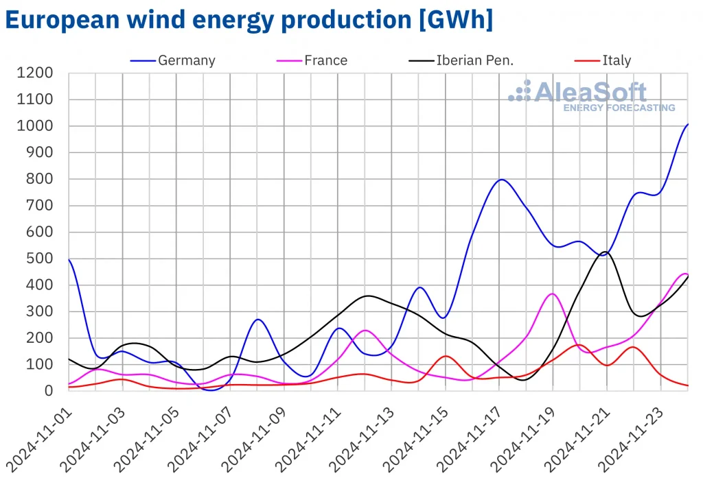 During the week, wind energy production reached historical generation records or records for the month of November in all analyzed markets. The markets of the Iberian Peninsula and France achieved historical wind energy production records. The Spanish market reached a production of 433 GW on Thursday, November 21, while the Portuguese and French markets registered their highest generation values on Sunday, November 24, with 110 GW and 441 GW, respectively. On the same day, the German market set a production record for November, with 1005 GW. Finally, the Italian market reached the second highest value for November, with 174 GW generated on the 20th.