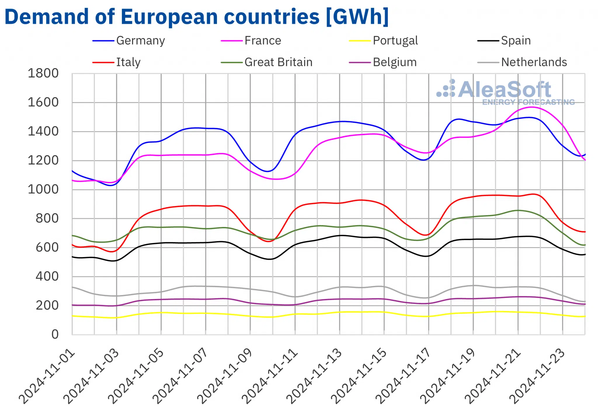 For the last week of November, AleaSoft Energy Forecasting’s demand forecasts indicate that demand will decrease in most major European electricity markets, except in Spain, Germany and Italy, where it will increase compared to the previous week.
