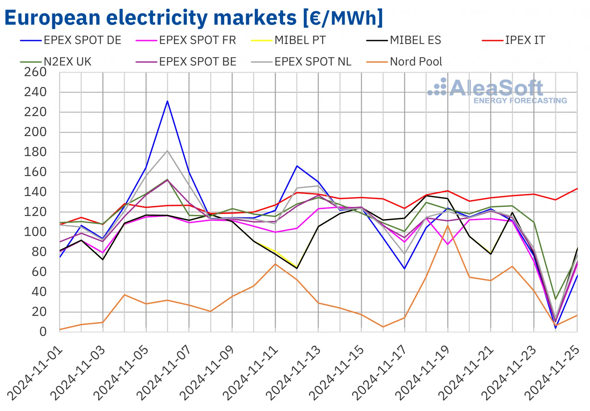 Regarding daily prices, on Sunday, November 24, they were below €14/MWh in most analyzed markets, except in the British and Italian markets. High wind energy production, together with lower demand on Sunday, led to these low prices in the European electricity markets. On that day, the German market registered the lowest price, €3.97/MWh. That price was the lowest in Germany since May 13. In the case of the Spanish and Portuguese markets, on Sunday prices were the lowest since June 3. The Belgian, French and Dutch markets registered their lowest prices since July 7, while the British market reached its lowest price since August 26.