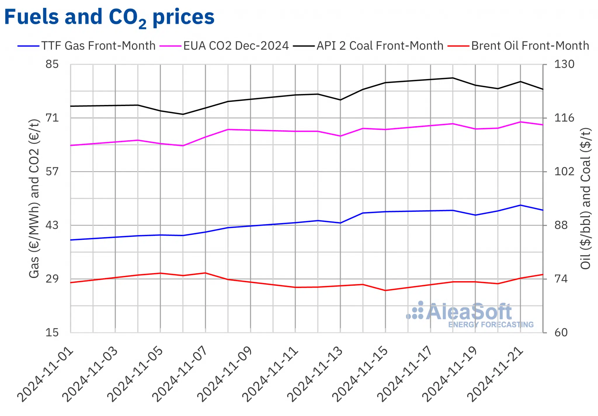 Regarding settlement prices of CO2 emission allowance futures in the EEX market for the reference contract of December 2024, they remained above €68/t during the third week of November. On Tuesday, November 19, these futures registered their weekly minimum settlement price, €68.13/t. In contrast, on Thursday, November 21, they reached their weekly maximum settlement price, €69.99/t. According to data analyzed at AleaSoft Energy Forecasting, this price was the highest since September 3. On Friday, November 22, prices fell by 1.0% compared to Thursday and the settlement price was €69.27/t, still 1.9% higher than the previous Friday.