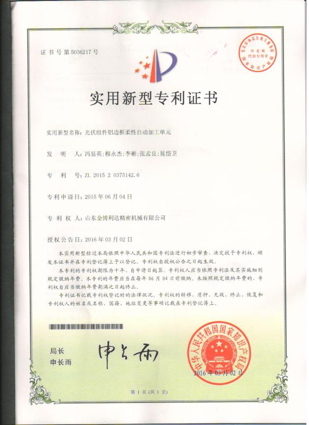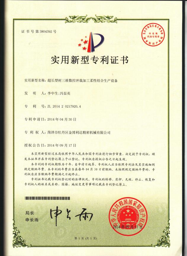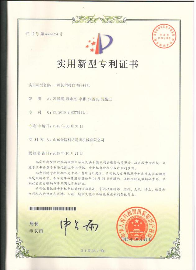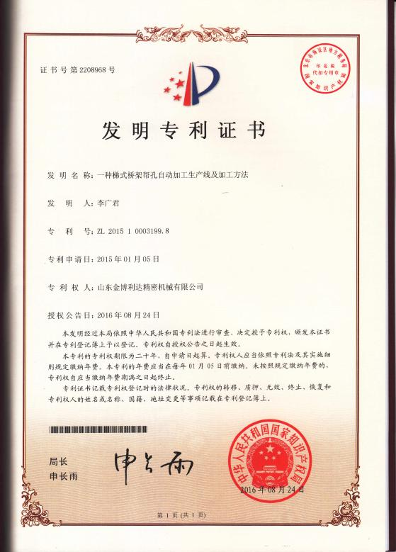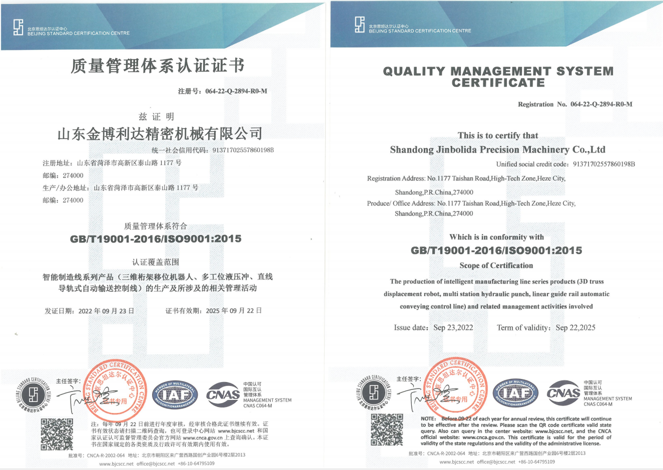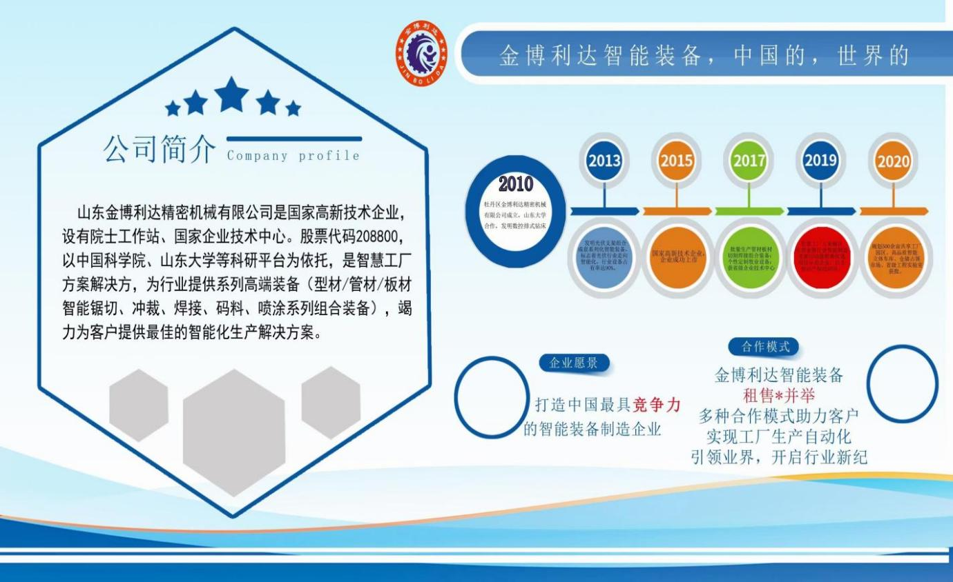Shandong Jinbolida Precision Machinery Co., Ltd. is a high-tech enterprise with total assets of 280 million yuan, including 120 million yuan in fixed assets and 60 million yuan in working capital; it owns 500 acres of delisted land and 20,000 square meters of office buildings and factory buildings. There are more than 1,000 employees, including 8 doctoral supervisors (senior engineers), 15 senior engineers, 20 graduate students, and 120 assembly technicians of various types. A strong scientific research team consisting of 2 academicians of the Chinese Academy of Engineering, 2 researchers of the Chinese Academy of Sciences, 5 senior engineers, 10 graduate students, and 20 undergraduates has been established. Shandong University has established the “Profile Intelligent Processing Equipment R&D Center” in the company, and the “Shandong University Graduate Workstation” is being actively prepared. The company currently has 25 patents and three Shandong Provincial Scientific and Technological Achievements. The technical content of its products has always been at the leading level in the same industry, with a market share of more than 90%, making it a well-deserved leader in the industry.