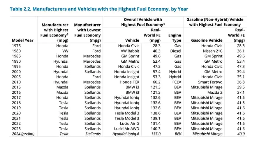 So, who are the good and the bad actors? Tesla has been the manufacturer with the highest fuel economy since 2016 when it began mass production of the Model 3 sedan. That’s unsurprising because Tesla only makes fully electric models. However, according to EPA data, Stellantis has manufactured the dirtiest cars since 2015. Both automakers will remain in the same spots in 2024, as per a preliminary estimate.