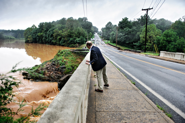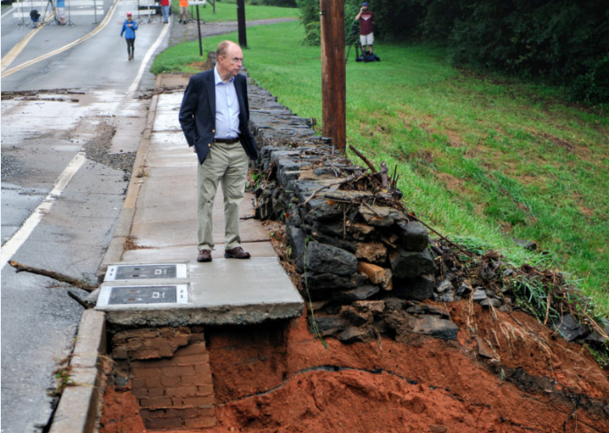 The flood in August, 2018 damaged the dam, making it clear that removing the dam would be the most sustainable, long-term solution. Kenneth R. Garren, president of the University of Lynchburg, was on site early the next morning to survey the damage. Photos by John McCormick.