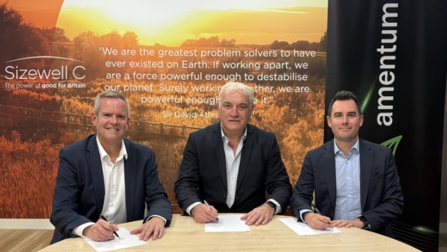 The signing of the contract by (from left) Jon Fowler, Amentum Vice President for Nuclear Power; Nigel Cann, Sizewell C Joint Managing Director; and James Bull, Amentum New Nuclear Director of Frameworks