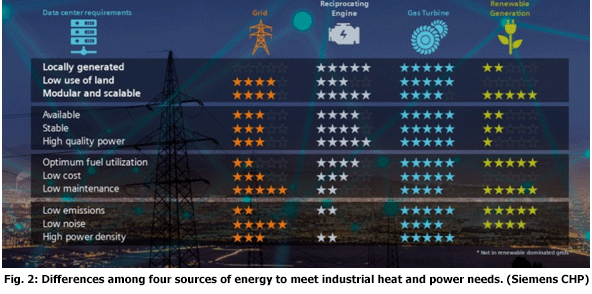 Gas turbines have other advantages over stationary reciprocating internal combustion engines (RICEs) that are often employed by the food and beverage industry. Advantages include higher power density; lower maintenance costs; better H2 fuel-handling capability; and lower GHG, pollutants, and noise emissions. Figure 2 (below) compares the differences among four primary sources of energy to meet industrial heat and power needs.