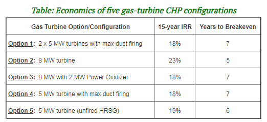 The following variables were considered: gas turbine sizes, from 5-8 MW; gas turbine redundancy; use of a heat recovery steam generator (HRSG), fired and unfired; and combining a gas turbine with an oxidizer. The Table below summarizes the results (note: IRR = internal rate of return).