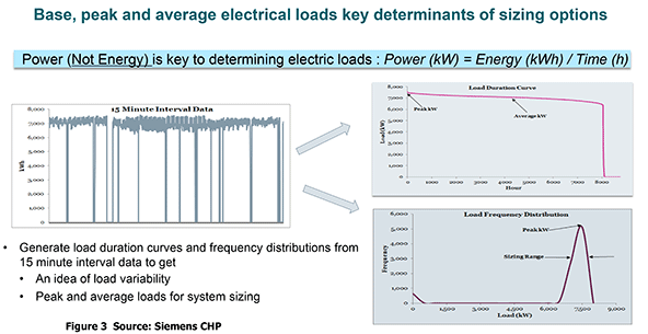 Electrical loads, for example, are key determinants of CHP system sizing options. Base, peak, and average electrical loads must be evaluated. To get an idea of load variability, a plant’s power (kW) load duration curves and frequency distributions should be generated from 15-minute interval data, as illustrated in Figure 3 (below).
