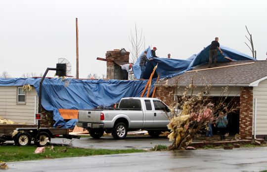People work to cover the holes in a roof after severe weather damaged homes on Plymouth Springmill Road just south of the intersection of Ohio Route 96 in Shelby, Ohio, on April 14, 2019. (Photo: Tom E. Puskar, AP)