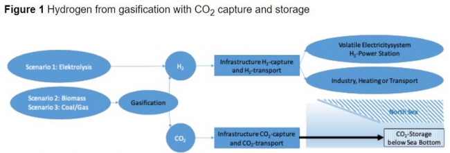 Figure 1 illustrates two alternative transition models to electrolysis via wind energy. In one model, biomass can be used for gasification to produce hydrogen while, in the second alternative, it is also possible to opt for coal gasification. Hydrogen is a clean fuel, and hydrogen production through gasification can also be clean as long as the CO2 produced during the gasification process is captured and stored under the North Sea.
