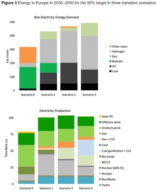 The cost advantage in this scenario results from the introduction of coal gasification with carbon capture storage and the displacement of nuclear energy; the investment costs of coal gasification with carbon capture storage are at least 40% lower than those of nuclear. Electrolysis is too expensive in this scenario because coal gasification also makes wind energy less dominant.