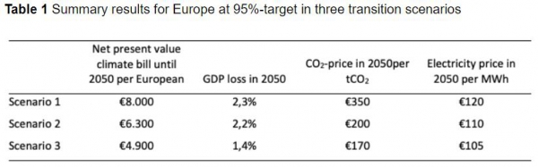 In comparison with scenario 1, the price of CO2 drops by 40% and that of electricity falls by 10%. As a result, the climate bill decreases by 20%, or from €8,000 down to €6,300 per person in Europe.