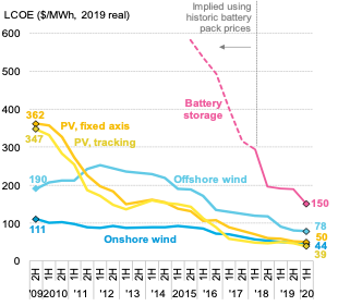 The latest analysis by research company BloombergNEF (BNEF) shows that the global benchmark levelized cost of electricity, or LCOE, for onshore wind and utility-scale PV, has fallen 9% and 4% since the second half of 2019 – to $44 and $50/MWh, respectively. Meanwhile, the benchmark LCOE for battery storage has tumbled to $150/MWh, about half of what it was two years ago.