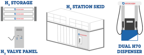 The station skid measures 28' x 9'6" x 13'4'. Its footprint does not include hydrogen source/storage, dispenser(s), or utilities.
