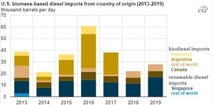 U.S. imports of biomass-based diesel, which include biodiesel and renewable diesel, grew 26 percent in 2019 to more than 27,000 barrels per day (b/d), reversing three years of decline. Imports of biomass-based diesel increased in 2019 because of the increase in renewable diesel imports from Singapore.