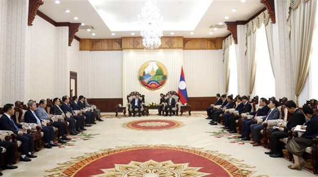 An overview of the meeting (Photo: VNA)Minister of Industry and Trade Nguyen Hong Dien had a meeting in Vientiane on April 8 with Lao Prime Minister Sonexay Siphandone who asked relevant ministries of the two sides to focus on seeking ways to remove diffi