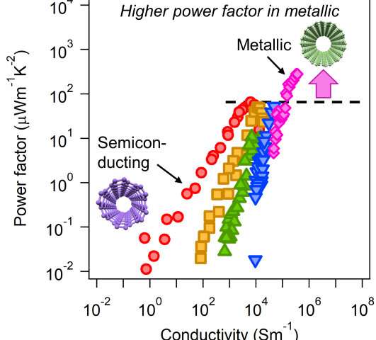 Scientists from Tokyo Metropolitan University have used aligned "metallic" carbon nanotubes to create a device which converts heat to electrical energy (a thermoelectric device) with a higher power output than pure semiconducting carbon nanotubes (CNTs).