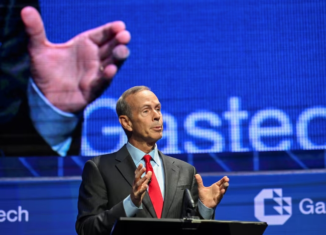 Chevron CEO Michael Wirth gives the keynote address as top energy executives and ministers meet in Houston for the annual Gastech conference in Houston, Texas, …