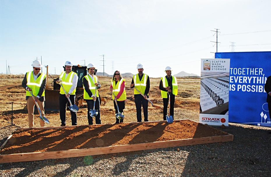 Strata Clean Energy President Josh Rogol (third from left) breaks ground on the Scatter Wash battery storage complex with partners, local dignitaries. (Credit: …