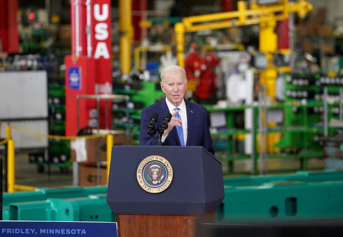 U.S. President Joe Biden delivers remarks during his visit to the Cummins Power Generation Facility in Fridley, Minnesota, U.S., April 3, 2023. REUTERS/Kevin La…