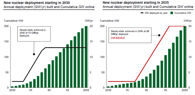 These graphs illustrate how rapidly scaling the nuclear industrial base would enable nearer-term decarbonization and increase capital efficiency, versus a five-…